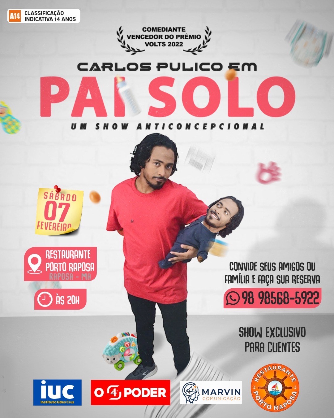 Reconhecido pelo talento e pela forte presença digital, Carlos Pulico é vencedor do Prêmio Volts de Melhor Comediante do Maranhão (2022), acumula quase 10 anos de carreira, mais de 30 milhões de visualizações em vídeos e mais de meio milhão de seguidores nas redes sociais. Recentemente, o humorista lotou o Teatro Arthur Azevedo, em São Luís, e chega agora à Raposa com o espetáculo “Pai Solo”, no qual aborda, com humor afiado e linguagem popular, situações do cotidiano, relações familiares e experiências pessoais, mantendo forte identificação com o público maranhense.